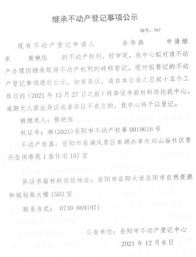 继承不动产登记公示 编号:(2021)继767号(余华燕)