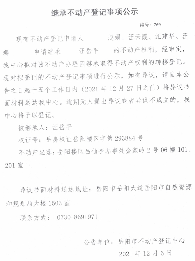 继承不动产登记公示 编号:(2021)继769号(赵娟)
