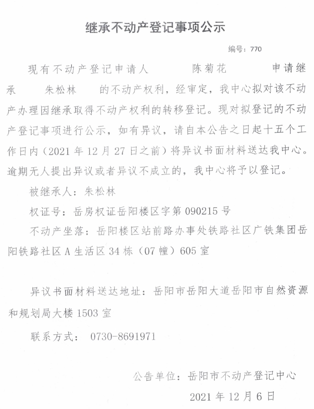 继承不动产登记公示 编号:(2021)继770号(陈菊花)