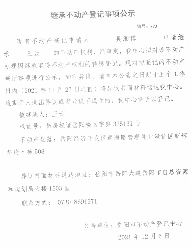继承不动产登记公示 编号:(2021)继773号(吴湘博)