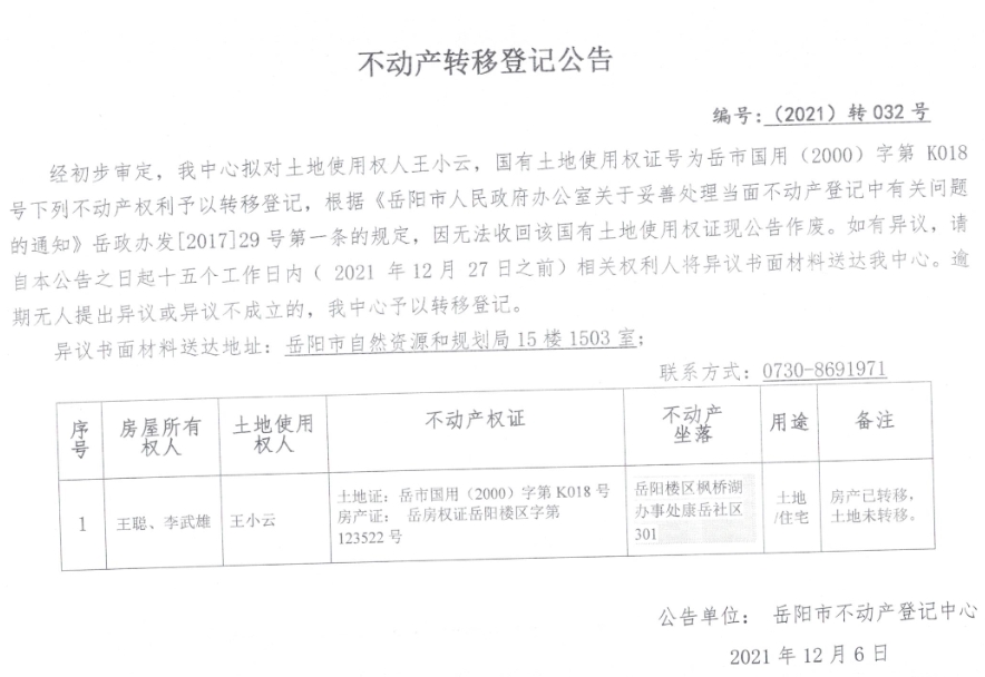 不动产转移登记公告 编号:(2021)转032号(王小云)
