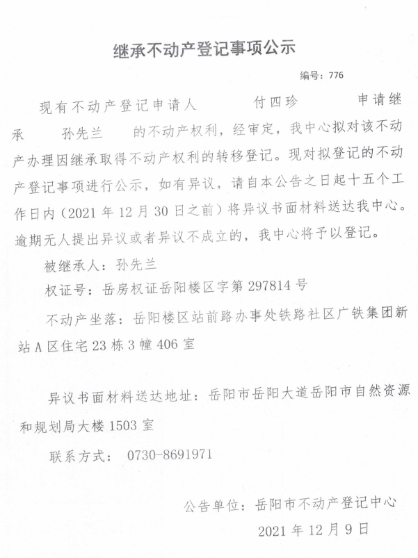 继承不动产登记公示 编号:(2021)继776号(付四珍)