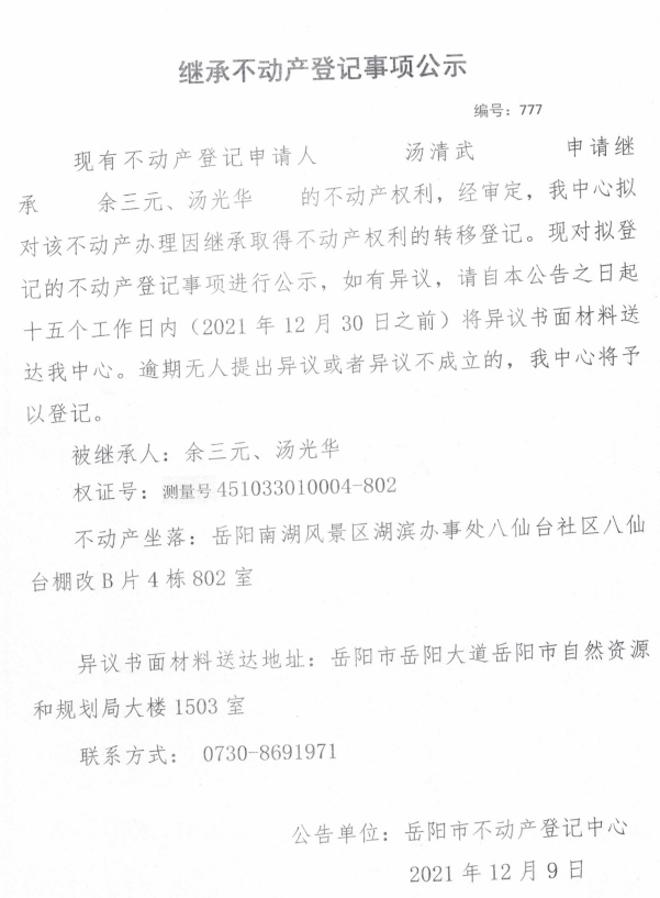 继承不动产登记公示 编号:(2021)继777号(汤清武)