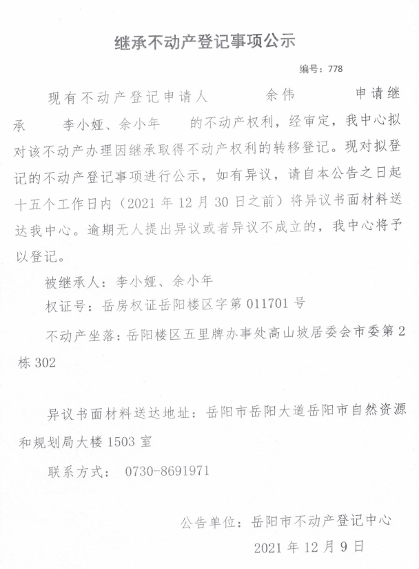 继承不动产登记公示 编号:(2021)继778号(余伟)