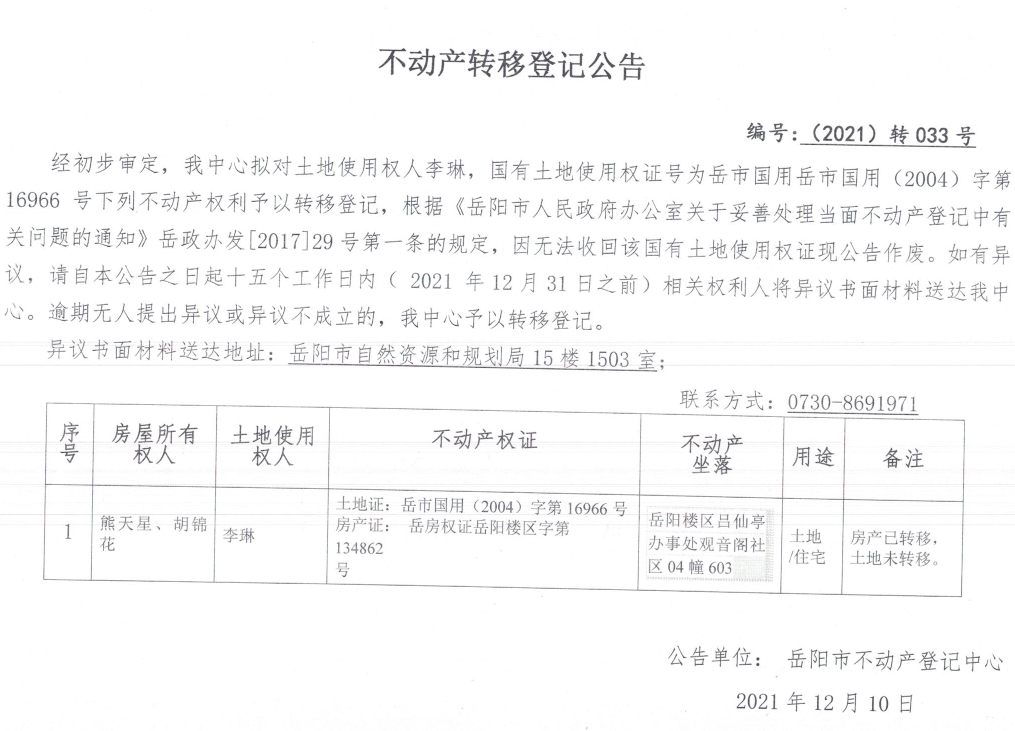 不动产转移登记公告 编号:转033号(李琳)
