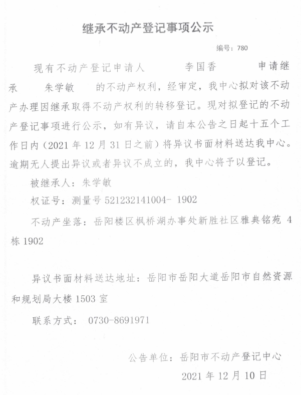 继承不动产登记公示 编号:(2021)继780号(李国香)