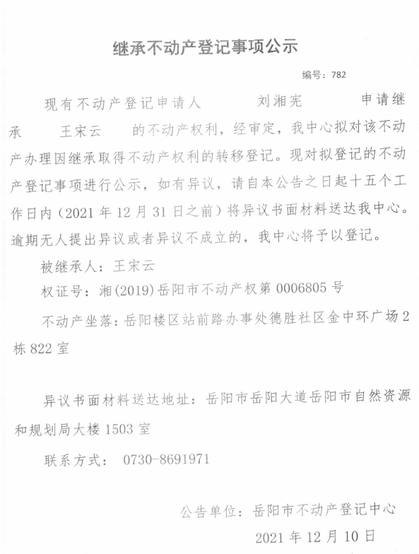 继承不动产登记公示 编号:(2021)继782号(刘湘宪)