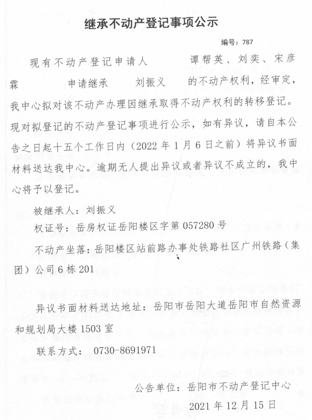 继承不动产登记公示 编号:(2021)继787号(谭帮英)