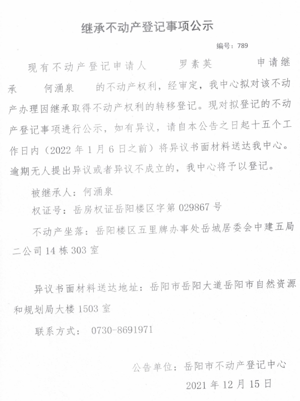 继承不动产登记公示 编号:(2021)继789号(罗素英)