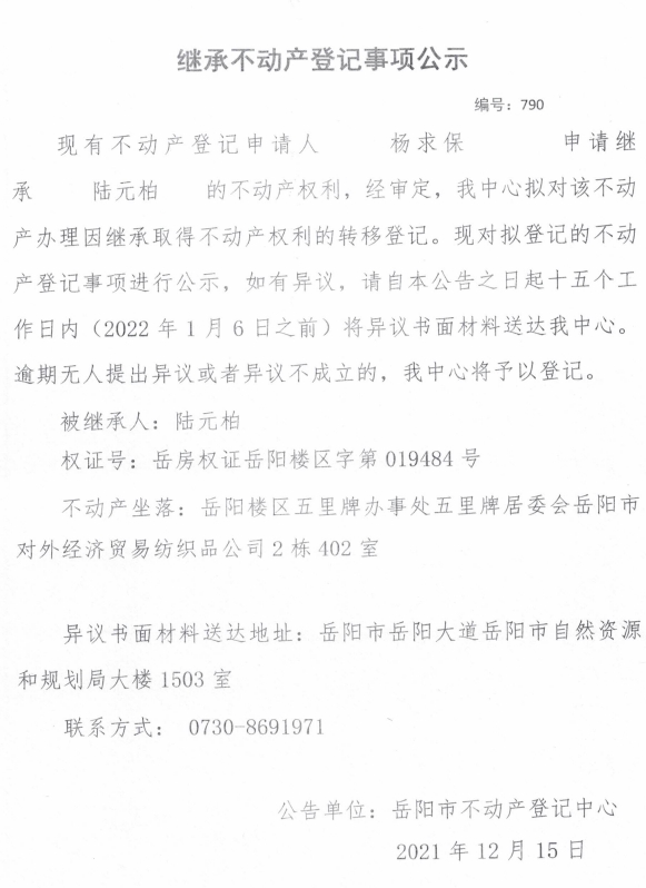 继承不动产登记公示 编号:(2021)继790号(杨求保)