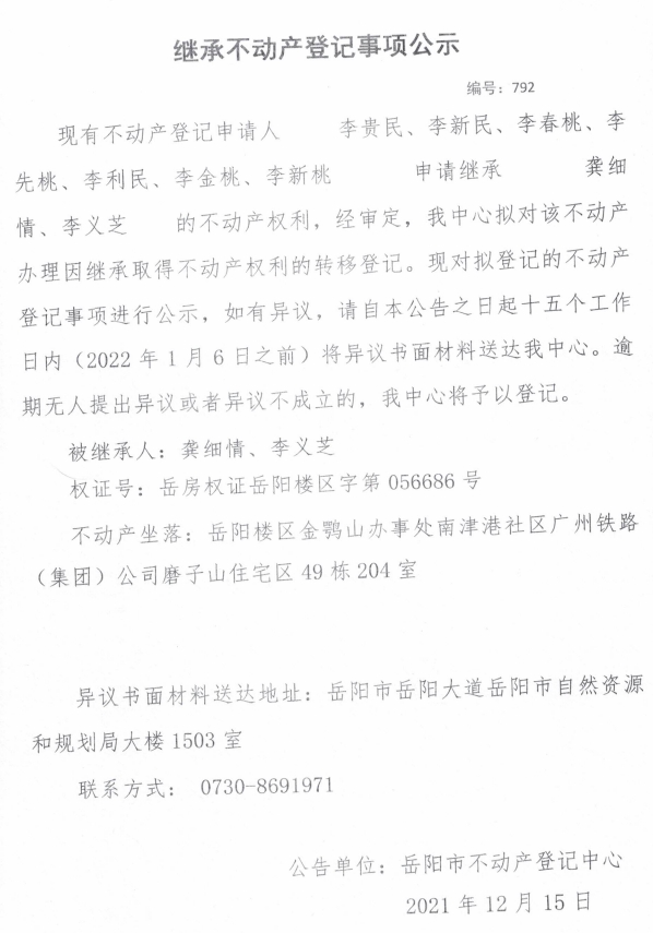 继承不动产登记公示 编号:(2021)继792号(李贵民)