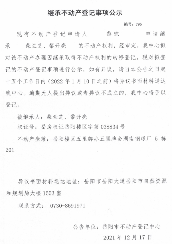 继承不动产登记公示 编号:(2021)继796号(黎琼)