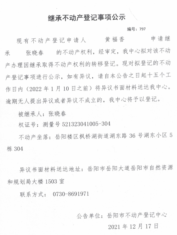 继承不动产登记公示 编号:(2021)继797号(黄福香)