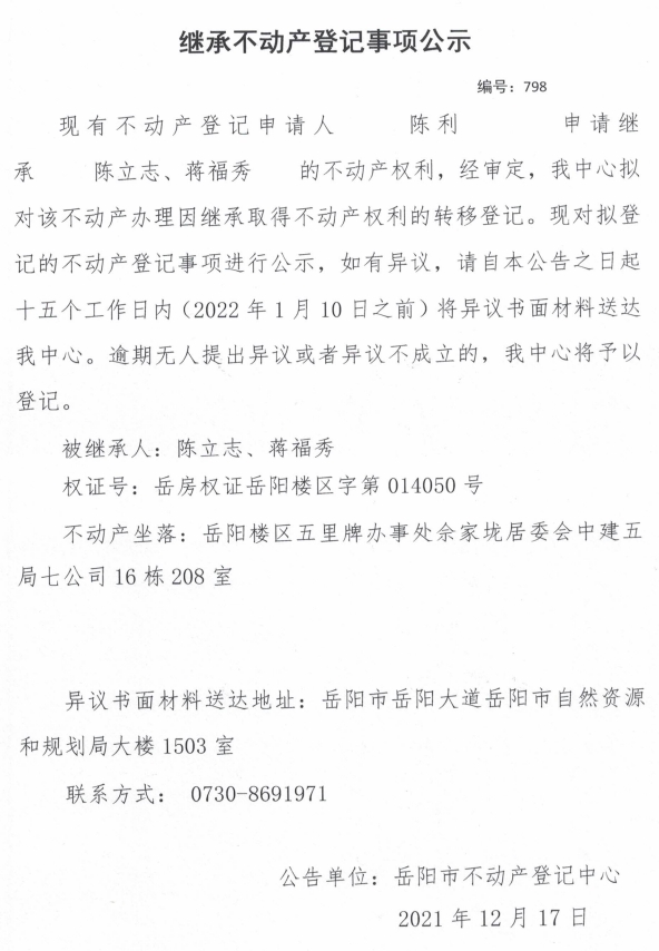 继承不动产登记公示 编号:(2021)继798号(陈利)