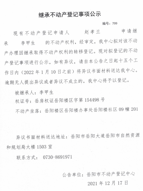继承不动产登记公示 编号:(2021)继799号(赵孝兰)