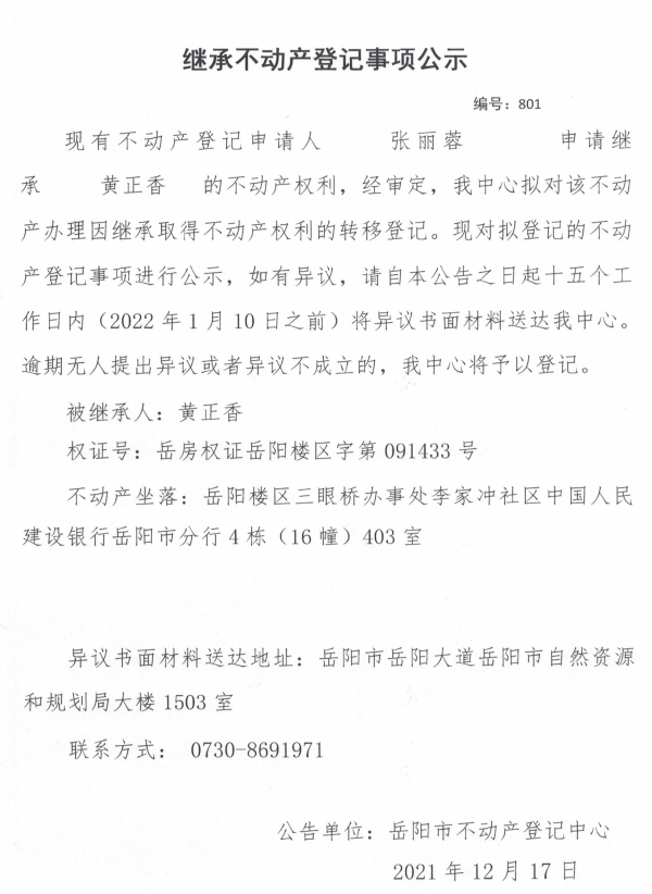 继承不动产登记公示 编号:(2021)继801号(张丽蓉)