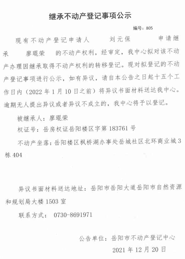继承不动产登记公示 编号:(2021)继805号(刘元保)