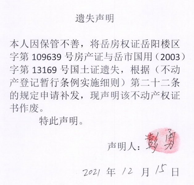 遗失声明(彭勇)
