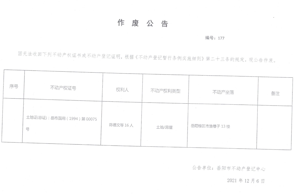 作废公告 编号:177(陈德文等16人 )
