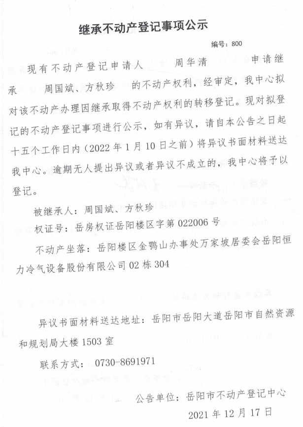 继承不动产登记公示 编号:(2021)继800号(周华清)