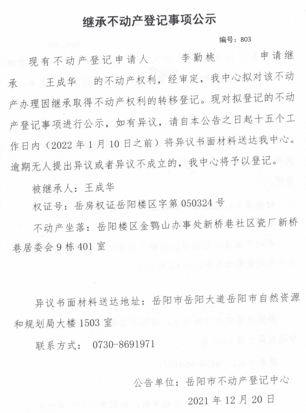 继承不动产登记公示 编号:(2021)继803号(李勤桃)