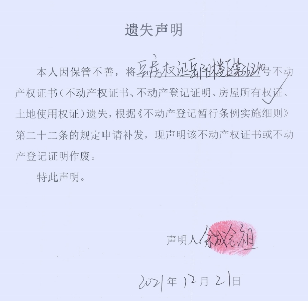 遗失声明 (余成念祖)
