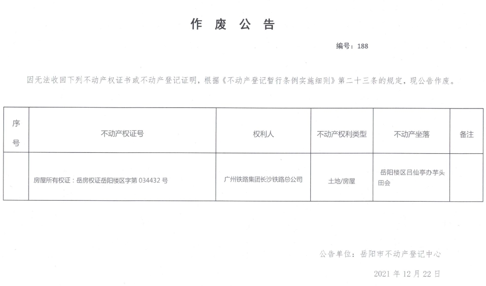 作废公告 编号188( 广州铁路集团长沙铁路总公司)