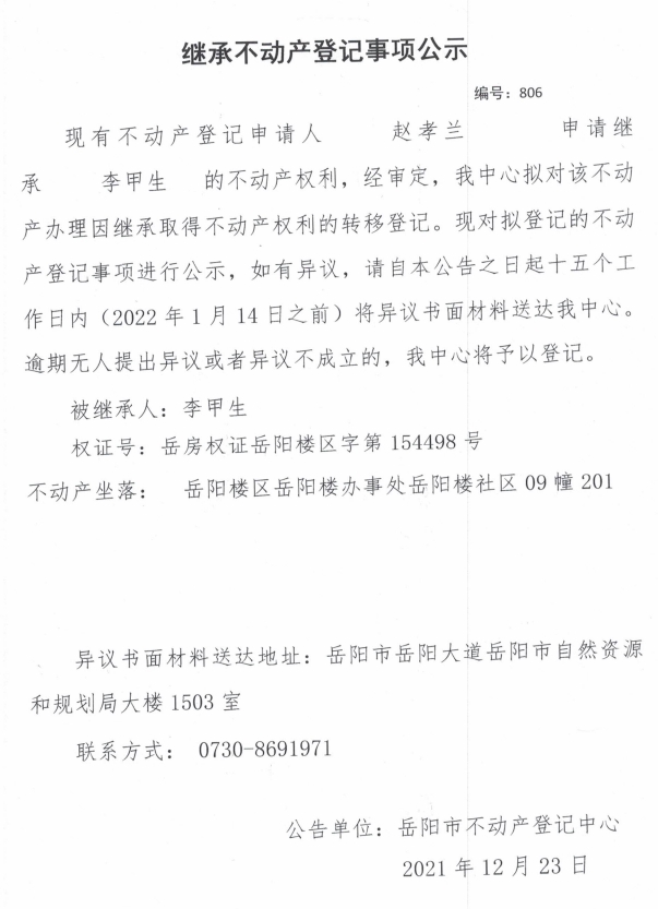 继承不动产登记公示 编号:(2021)继806号(赵孝兰)