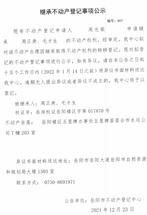 继承不动产登记公示 编号:(2021)继807号(周光荣)