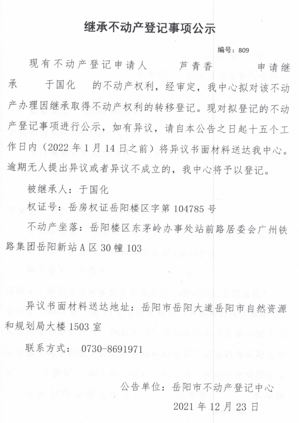 继承不动产登记公示 编号:(2021)继809号(芦青香)