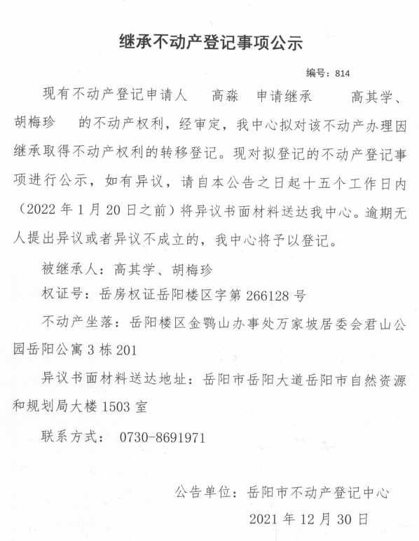 继承不动产登记公示 编号:(2022)继814号(高淼)