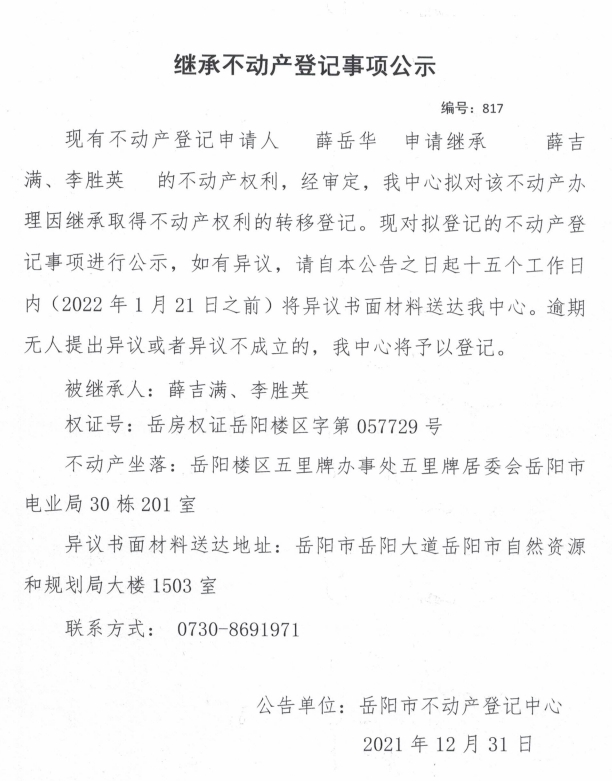 继承不动产登记公示 编号:(2022)继817号(薛岳华)