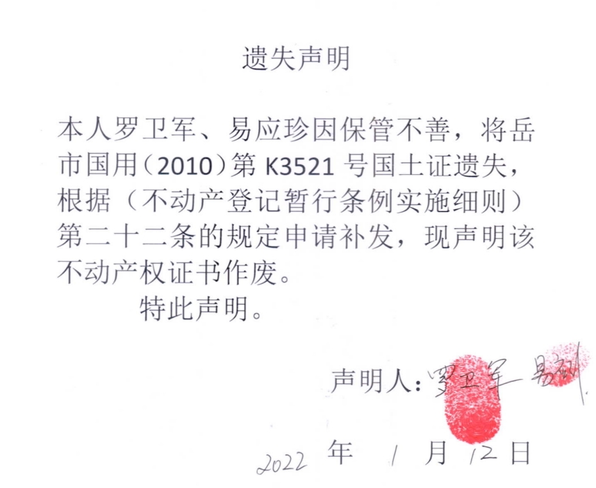遗失声明(罗卫军、易应珍)