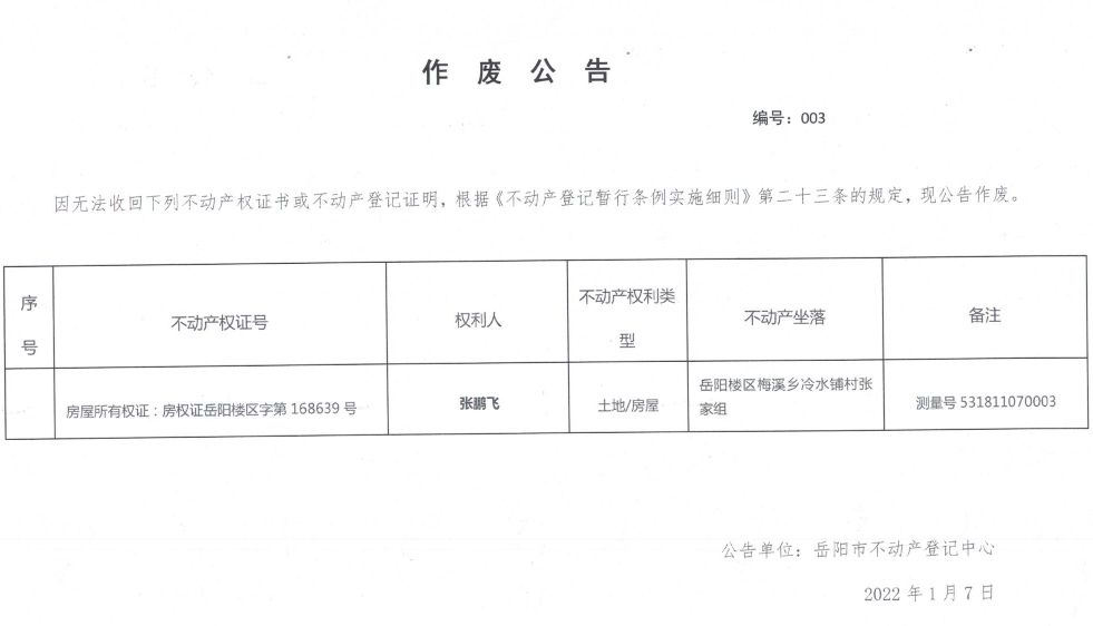 作废公告 编号:003(张鹏飞)