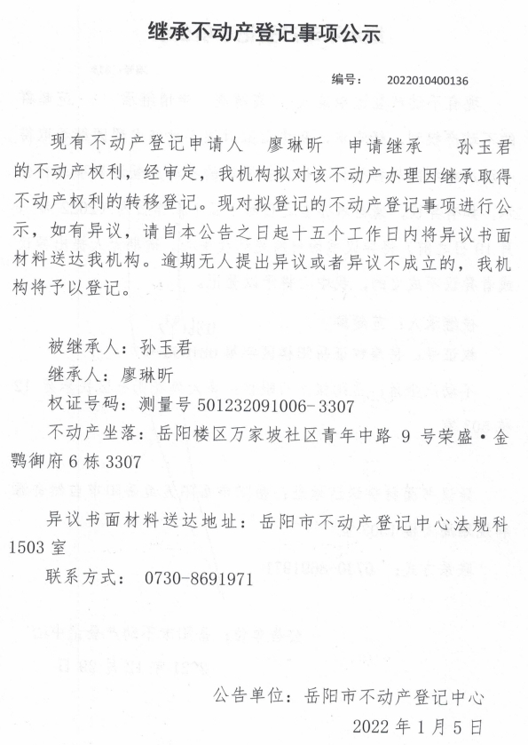 继承不动产登记公示 编号:廖琳昕