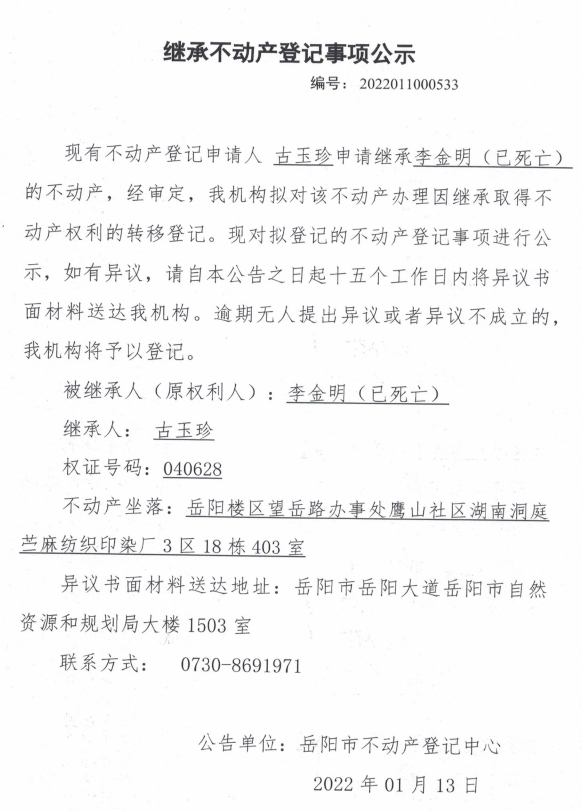 继承不动产登记公示 编号:古玉珍