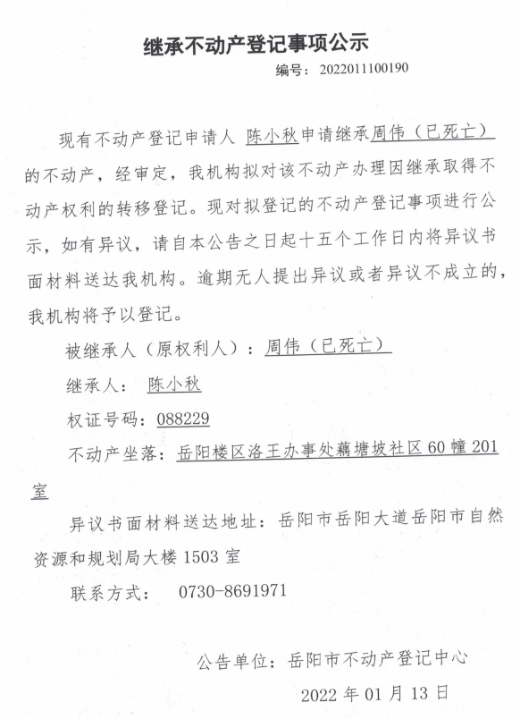继承不动产登记公示 编号:陈小秋