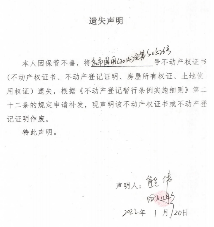 遗失声明(熊伟、白欣彤)