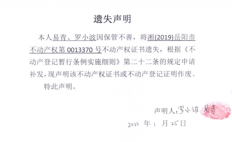 遗失声明(罗小波、易青)