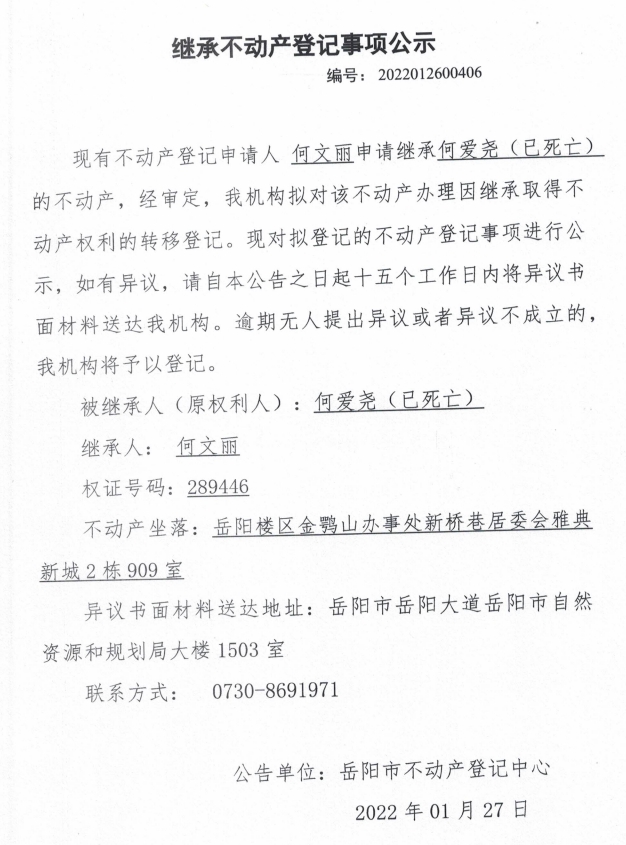 继承不动产登记公示 编号:(何文丽)