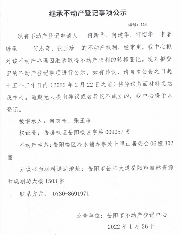 继承不动产登记公示 编号:(何新华)