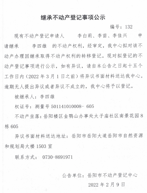 继承不动产登记公示 编号:(李苗)