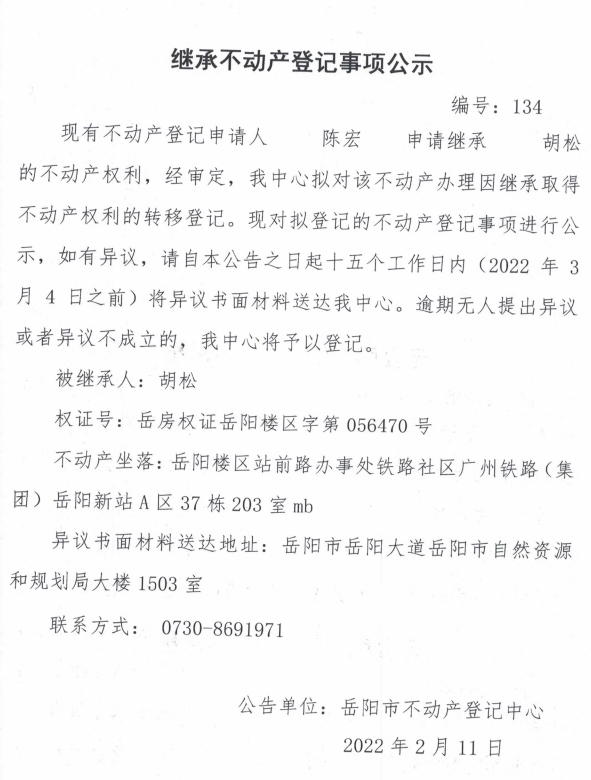 继承不动产登记公示 编号:(陈宏)