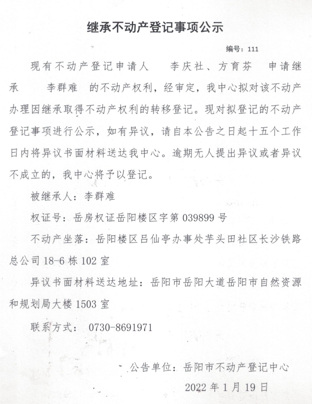 继承不动产登记公示 编号:(李庆社、方育芬)