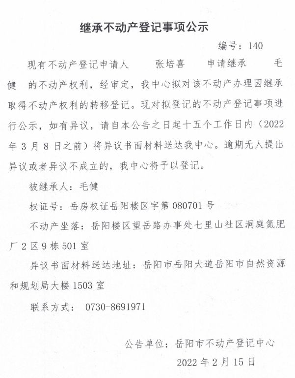继承不动产登记公示 编号:(张培喜)