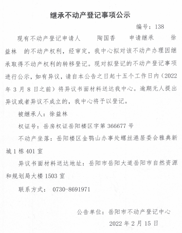 继承不动产登记公示 编号:(陶国香)