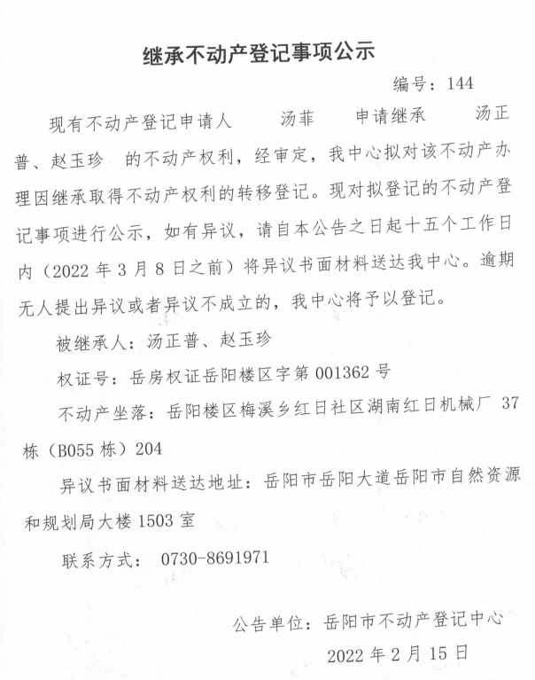 继承不动产登记公示 编号:(汤菲)