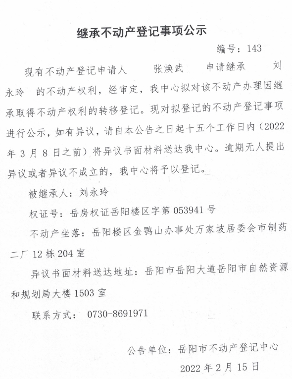 继承不动产登记公示 编号:(张焕武)