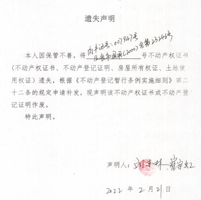 遗失声明( 刘东林、崔宇虹)