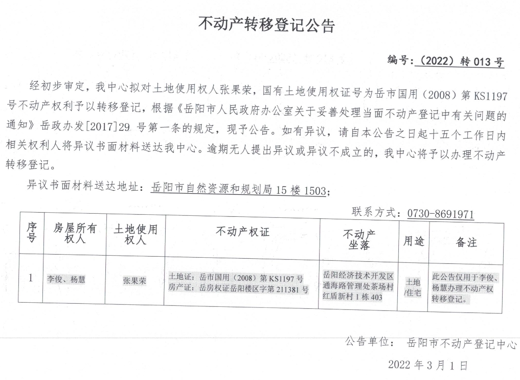 不动产转移登记公告 编号:(2022)转013号(张果荣)
